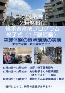 東京大空襲・戦災資料センターでは空襲体験者の高齢化に伴い、2021年度から戦後世代が空襲体験を語り継ぐ、「継承事業」をおこなってきました。2023年度より「継承者育成プログラム」を実施し、これまで5人の継承者が誕生しました。このたび、新たに関隆史さん、丸谷裕子さん2名の継承者がプログラムを完遂したため、修了式を下記のとおり開催します。