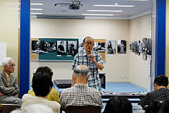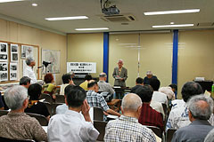 続いて、今日のメインゲストである鈴木賢士さんに登場いただき、7月25日からセンターで開催されている特別展「東京大空襲の生き証人」についてのギャラリートークとなりました。取材を始めたきっかけや今回の著書、写真展の反響、戦争被害をめぐる裁判などをめぐって熱き思いが語られ、さらにスライドプロジェクターを使って写真の上映もおこなわれて、深く胸を打ちました。