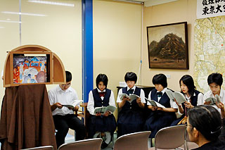 都立芝商業高等学校演劇部のみなさん。この紙芝居『東京大空襲』は、都立葛飾野高校美術部が制作したものです。川澄先生によると、「声をかけてくだされば、どこへでも上演に出向きます」とのこと。
