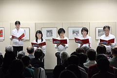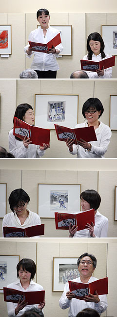 2月25日(水)から4月5日(日)まで、2009年の第1回特別展として「『死んでもブレストを』原画展−−その時、墨田電話局では何が起こったか」を開催しましたが、その一環として、4月4日の土曜日2時から、北原久仁香さんと朗読わーく「言の葉を愛でる」のみなさんによる「朗読会『死んでもブレストを』」が開かれました。(写真左から、北原久仁香さん、五十嵐妙さん、枝木美香さん、前田はるみさん、山本佳克さん)