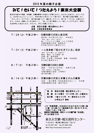 紙芝居や絵本の朗読、音楽劇、空襲体験者のお話などを聞きながら、お父さんお母さん、おじいちゃん、おばあちゃんといっしょに、平和や命の大切さについて語り合う、夏の親子企画を開催します。「みる・きく」だけでなく、絵手紙を書いたり、鶴を折ったりして、思いを「つたえる」企画もあります。今年は、栄養士さんをお招きして、「食」から見た戦争について話していただきます。学校の自由研究にも役立ちます。みなさん、ぜひご来館ください。